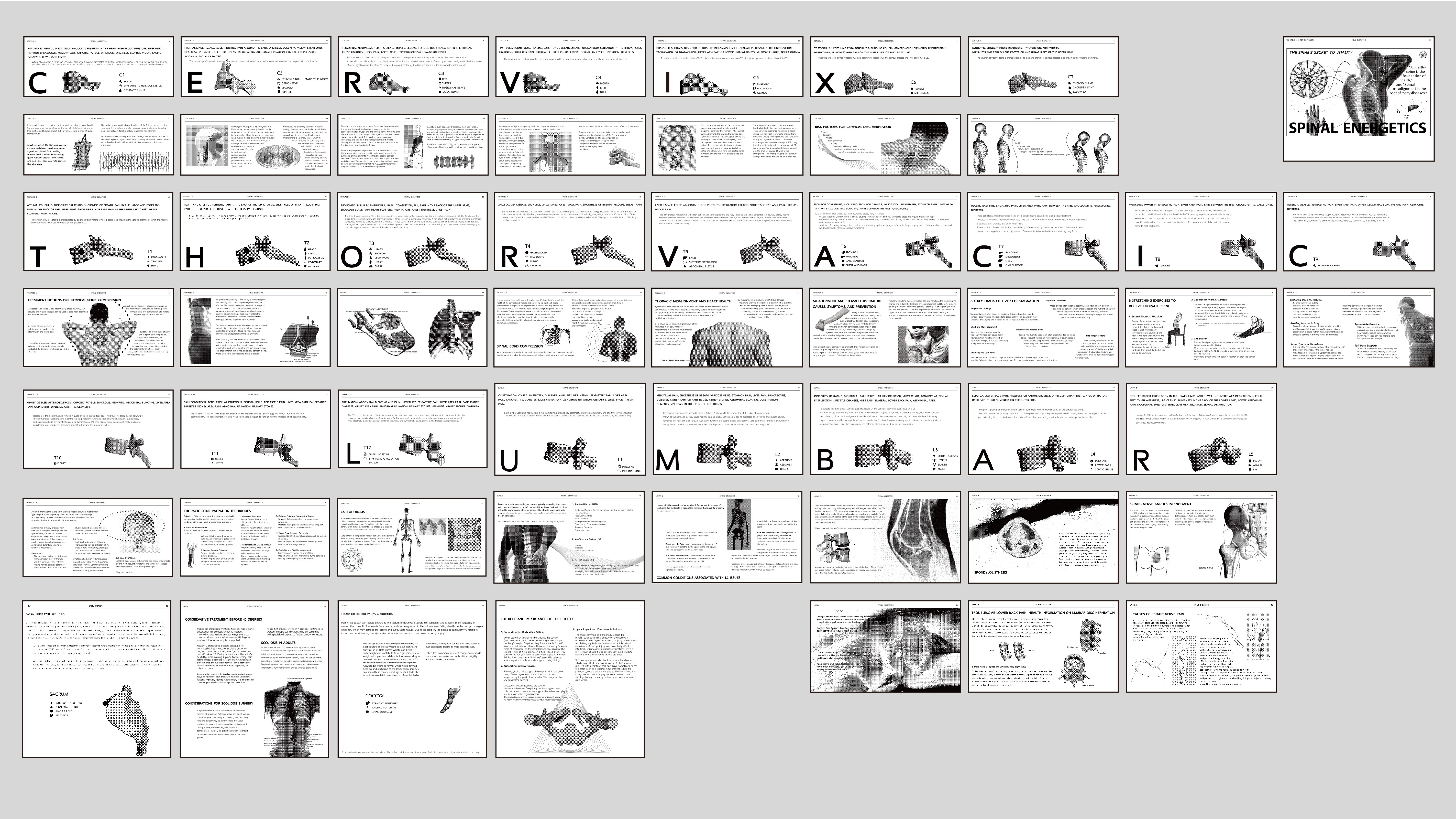 This project fuses traditional Chinese medicine concepts and Western energy therapy principles into a infographic, employing a traditional “dragon scale” binding to visually connect spinal segments, organ health, and natural energy flow in a culturally rich, contemporary format.